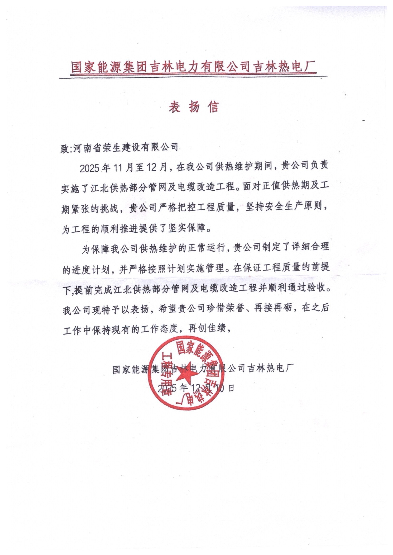 2025吉林热电厂表扬信